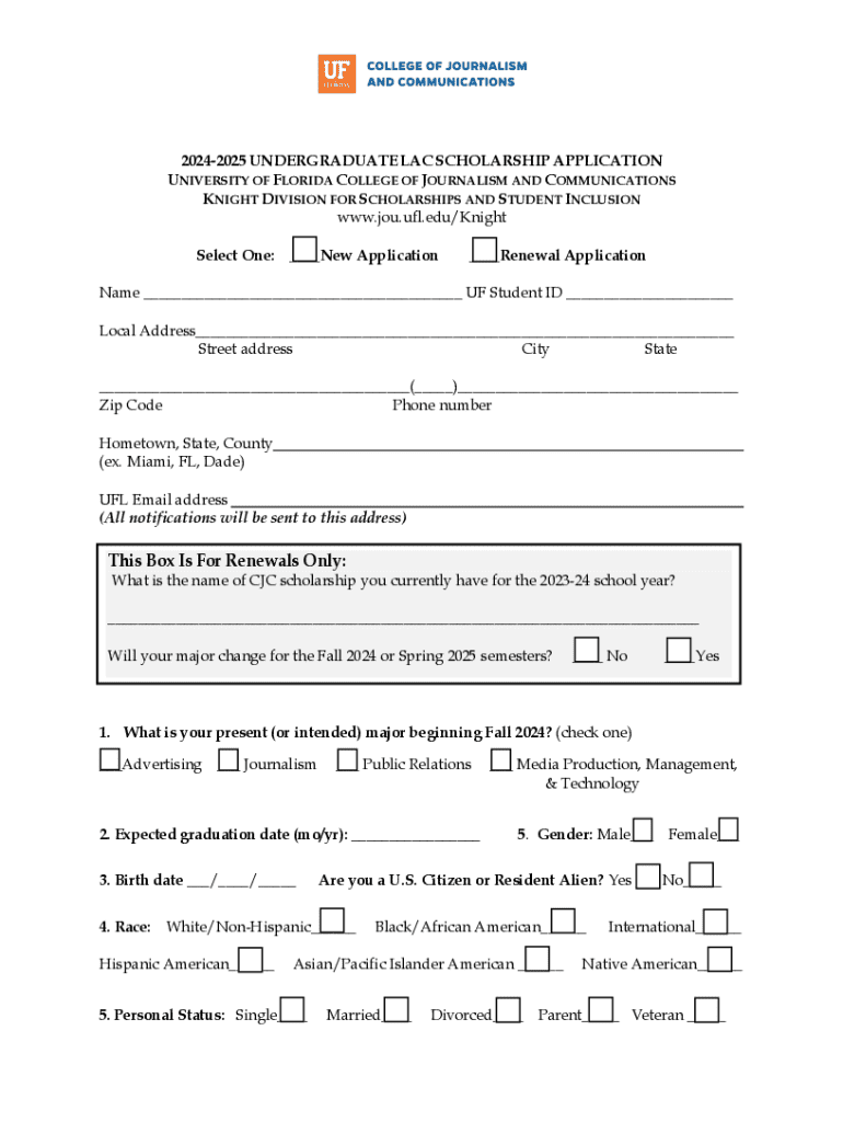 This document outlines the application process for undergraduate scholarships offered by the University of Florida\'s College of Journalism and Communications for the academic year 2024-2025. It includes