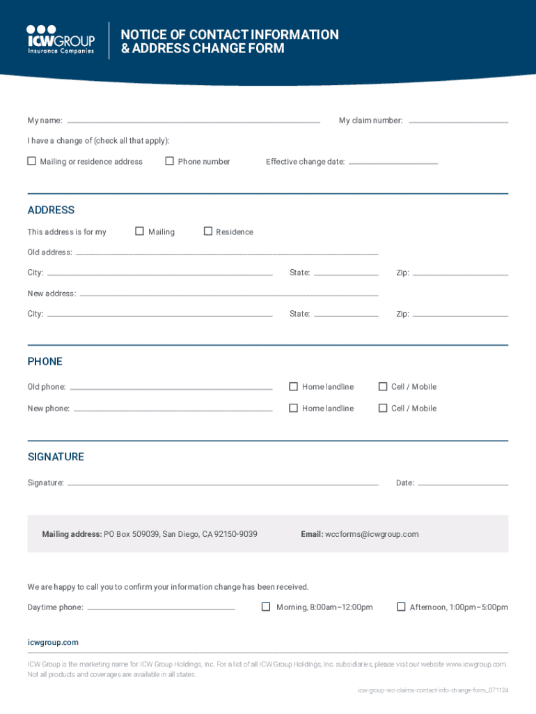 Formulario utilizado para notificar cambios en la información de contacto, como dirección postal y número de teléfono, asociado a un número de reclamación.