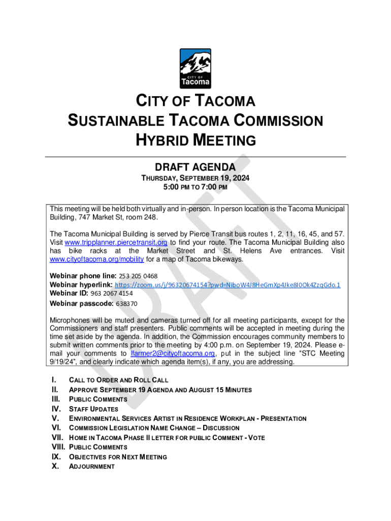 CITY OF TACOMA SUSTAINABLE TACOMA COMMISSION HYBRID MEETING DRAFT AGENDA THURSDAY, SEPTEMBER 19, 2024 5:00 PM TO 7:00 PM This meeting will be held both virtually and inperson. In person location is the Tacoma Municipal Building, 747 Market St, room 248. The Tacoma Municipal Building is served by Pierce Transit bus routes 1, 2, 11, 16, 45, and 57. Visit www.tripplanner.piercetransit.org to find your route. The Tacoma Municipal Building also has bike racks at the Market Street and St. Helens...