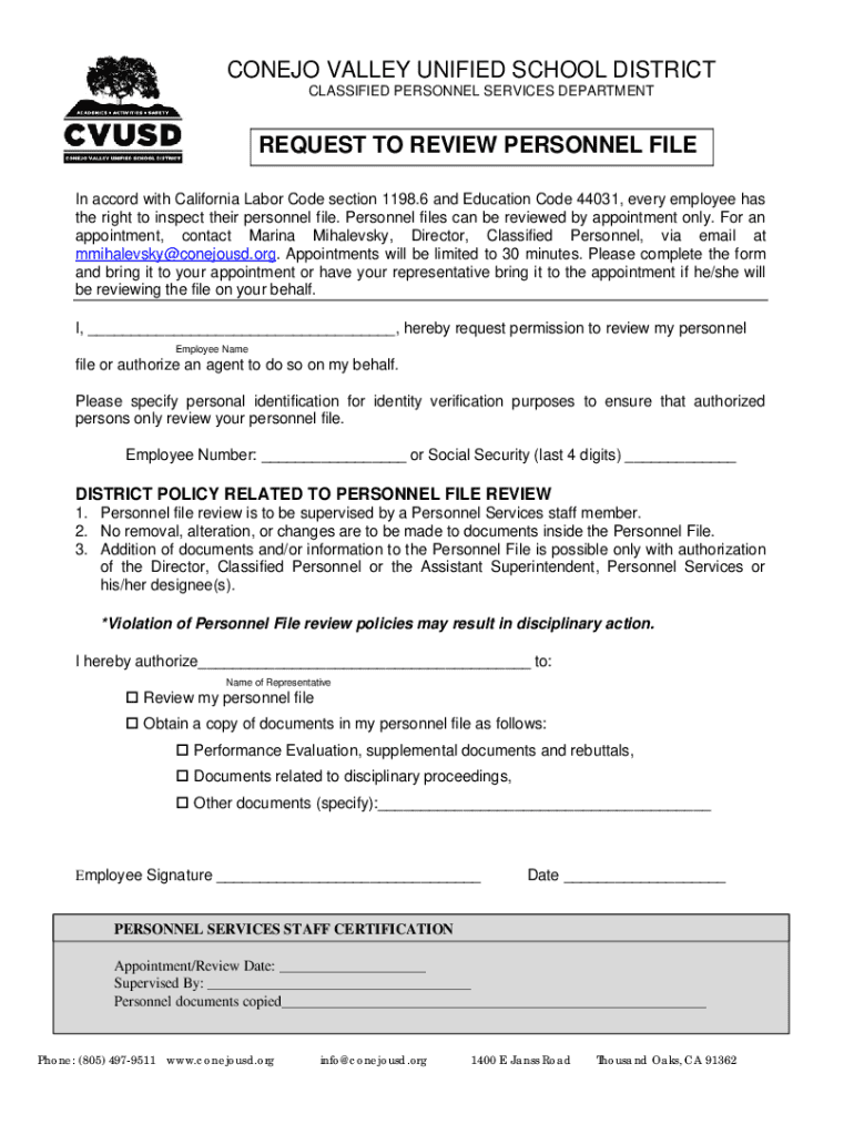 This form is used by employees of the Conejo Valley Unified School District to request permission to inspect their personnel file in accordance with California Labor Code and Education Code. It outlines the procedure for reviewing personnel files and requires the employee\'s identification to ensure authorized access.