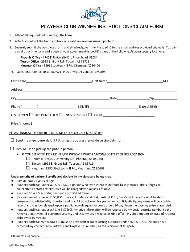 Este formulario es para los ganadores del Club de Jugadores que desean reclamar su premio. Se requiere que completen todos los campos requeridos y firmen el formulario. También deben incluir una foto de una identificación emitida por el gobierno y enviar el formulario completado a la dirección de correo electrónico proporcionada o llevarlo a las oficinas de la Lotería de Arizona.