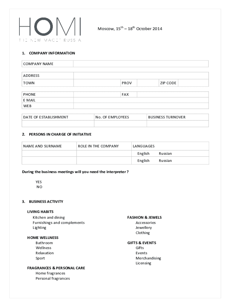 Moscow, 15th 18th October 20141. COMPANY INFORMATION COMPANY NAME ADDRESS TOWNPROVPHONE E MAIL WEBFAXDATE OF ESTABLISHMENTNo. OF EMPLOYEESZIP CODEBUSINESS TURNOVER2. PERSONS IN CHARGE OF INITIATIVE