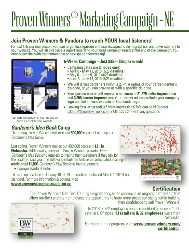 Proven Winners Marketing Campaign NE Join Proven Winners & Pandora to reach YOUR local listeners! For just 1.4 per impression, you can target local garden enthusiasts, specific demographics, and drive listeners to your website. You will also receive a report regarding your local campaign reach at the end of the campaign. You cannot get that with traditional radio or newspaper advertising!6Week Campaign Just $350 $58 per week! Campaign dates are (choose one): April 8 May 12,