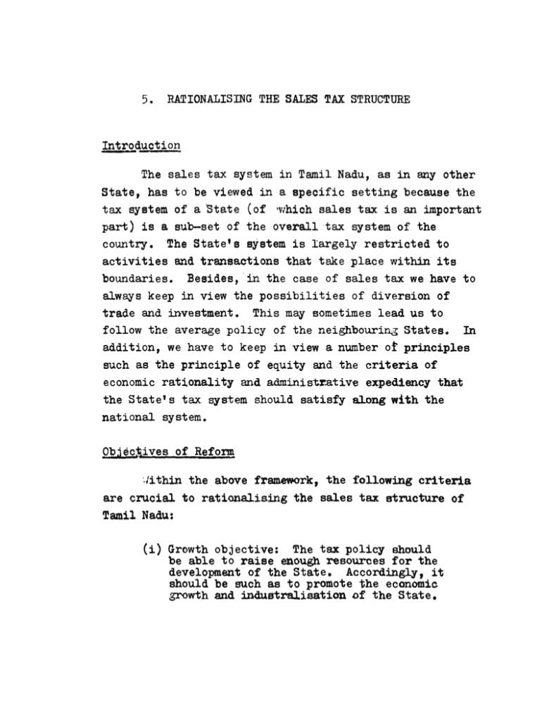 5.RATIONALISING THE SALES TAX STRUCTUREIntroduction The sales tax system in Tamil Nadu, as in any other State, has to be viewed in a specific setting because the tax system of a State (of\'which sales tax is an importantpart) is a subset of the overall tax system of the country.The State\'s system is largely restricted toactivities and transactions that take place within its boundaries.Besides, in the case of sales tax we have toalways keep in view the possibilities of diversion of trade and...