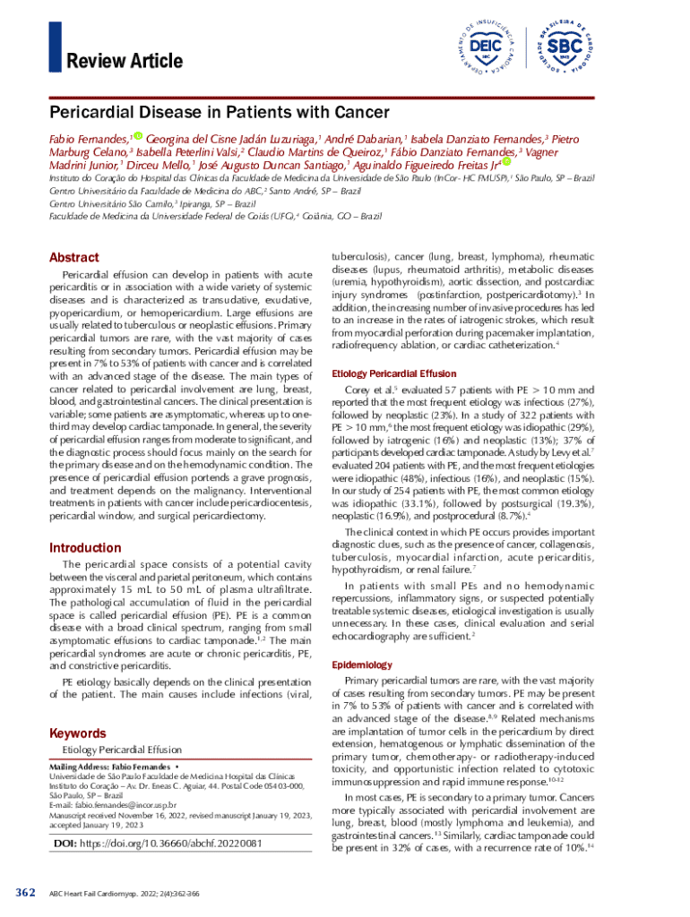 DE B R DAIELOASOCAMENTOLEIRA DRDIODACADEPRTSICASBCCARDEICAEIGIINSUFICCIAReview ArticleENDAPericardial Disease in Patients with Cancer Fabio Fernandes,1 Georgina del Cisne Jadn Luzuriaga,1 Andr Dabarian,1