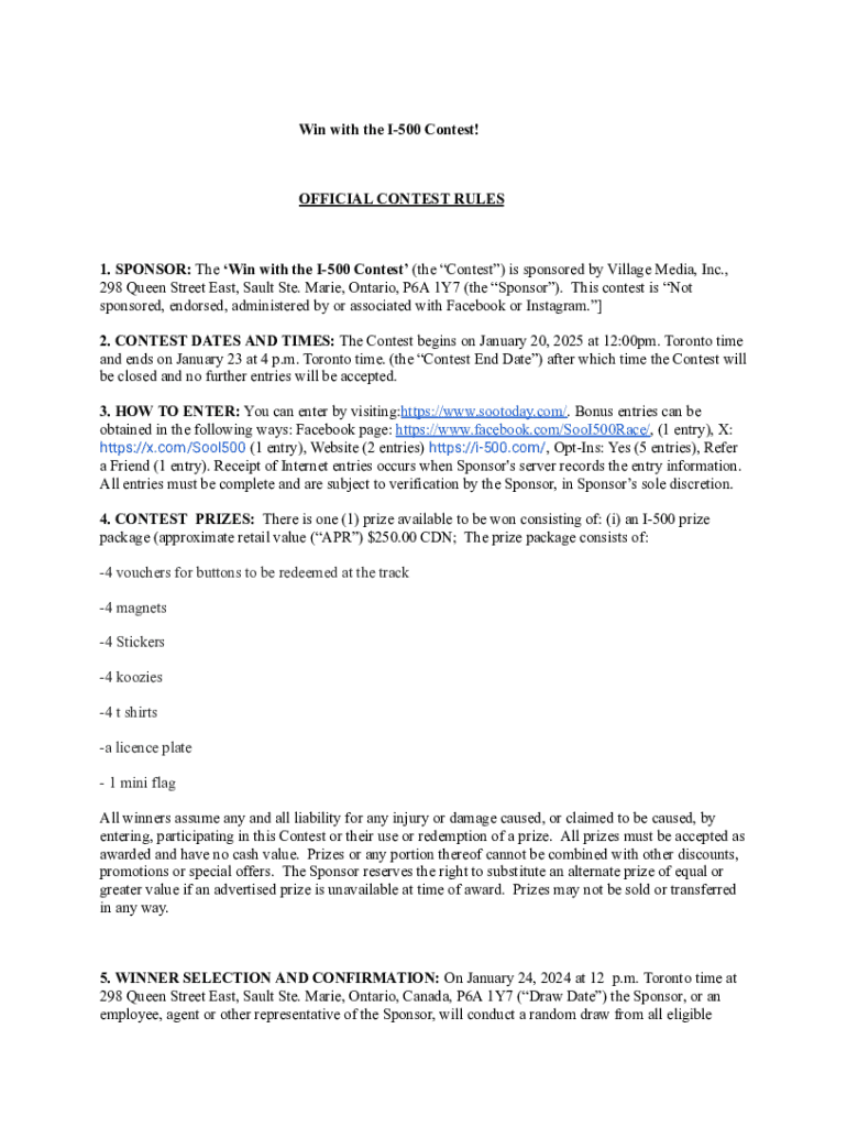 This document outlines the official rules and regulations for the Win with the I-500 Contest sponsored by Village Media, Inc. Details include contest dates, how to enter, eligibility, prize information,