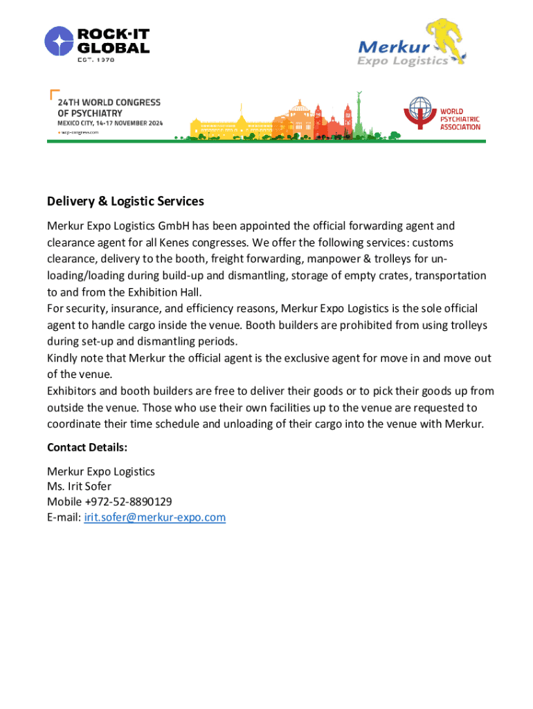 Delivery & Logistic Services Merkur Expo Logistics GmbH has been appointed the official forwarding agent and clearance agent for all Kenes congresses. We offer the following services: customs clearance, delivery to the booth, freight forwarding, manpower & trolleys for un loading/loading during buildup and dismantling, storage of empty crates, transportation to and from the Exhibition Hall. For security, insurance, and efficiency reasons, Merkur Expo Logistics is the sole official agent to...