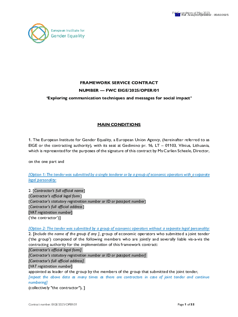 El contrato marco FWC EIGE/2025/OPER/01 se refiere a la exploración de técnicas de comunicación y mensajes para un impacto social. Establece las condiciones generales y especiales que regularán
