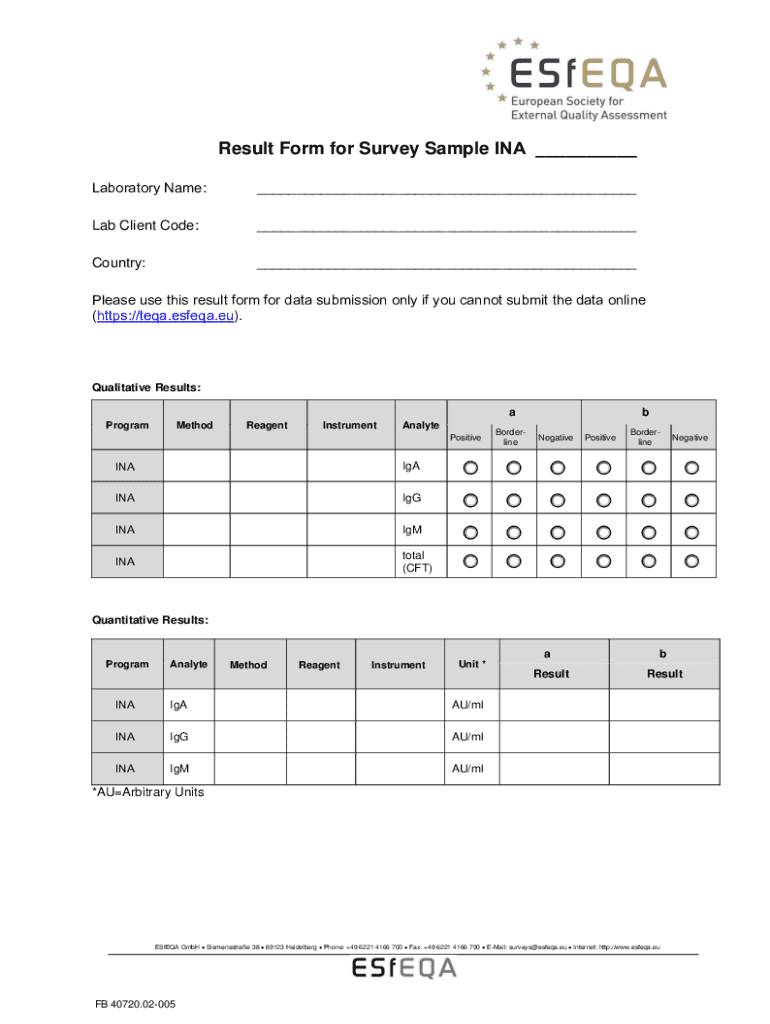This form is designed for data submission in cases where online submission is not possible. It includes sections for qualitative and quantitative results for various analytes related to the INA program.