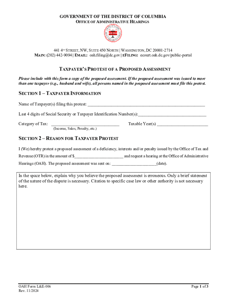 This form is used by taxpayers to protest a proposed assessment of deficiency, interests, and/or penalty issued by the Office of Tax and Revenue (OTR). It includes sections for taxpayer information, the reason for the protest, and options for language access and reasonable accommodations.