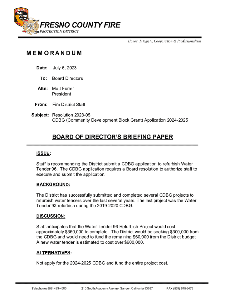 FRESNO COUNTY FIRE PROTECTION DISTRICTHonor, Integrity, Cooperation & ProfessionalismMEMORANDUM Date: To:July 6, 2023 Board DirectorsAttn: Matt Furrer President From:Fire District StaffSubject: Resolution 202305 CDBG (Community Development Block Grant) Application 20242025BOARD OF DIRECTORS BRIEFING PAPER___ ISSUE: Staff is recommending the District submit a CDBG application to refurbish Water Tender 96. The CDBG application requires a Board resolution to authorize staff to execute and submit...