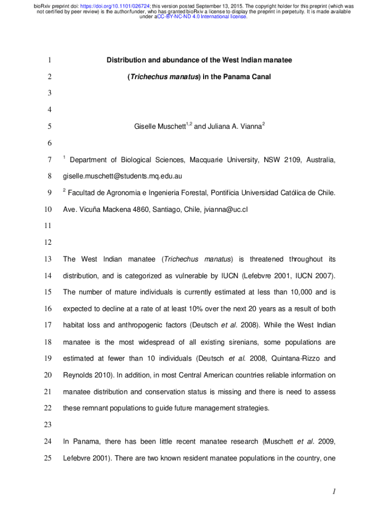 bioRxiv preprint doi: https://doi.org/10.1101/026724; this version posted September 13, 2015. The copyright holder for this preprint (which was not certified by peer review) is the author/funder, who has granted bioRxiv a license to display the preprint in perpetuity. It is made available under aCCBYNCND 4.0 International license.1Distribution and abundance of the West Indian manatee2(Trichechus manatus) in the Panama Canal3 4 Giselle Muschett1,2 and Juliana A. Vianna25 6 718giselle