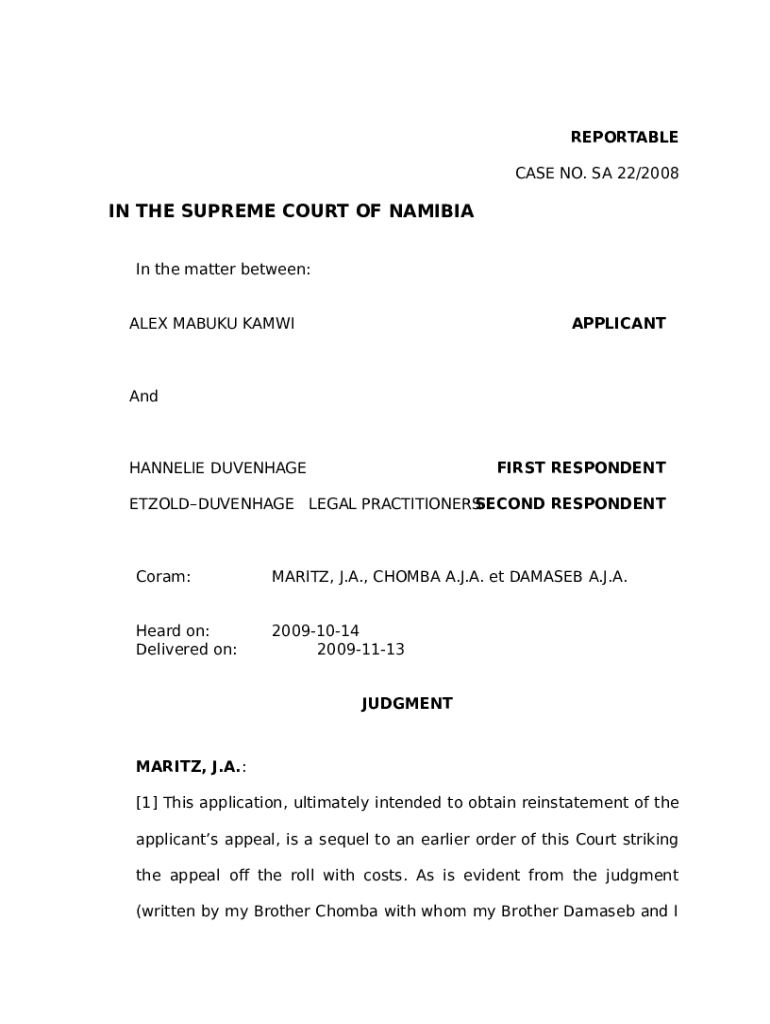 REPORTABLE CASE NO. SA 22/2008IN THE SUPREME COURT OF NAMIBIA In the matter between: ALEX MABUKU KAMWIAPPLICANTAndHANNELIE DUVENHAGEFIRST RESPONDENTETZOLDDUVENHAGE LEGAL PRACTITIONERSSECOND RESPONDENTCoram:MARITZ, J.A., CHOMBA A.J.A. et DAMASEB A.J.A.Heard on: Delivered on:20091014 20091113 JUDGMENTMARITZ, J.A.: [1] This application, ultimately intended to obtain reinstatement of the applicants appeal, is a sequel to an earlier order of this Court striking the appeal off the roll with costs