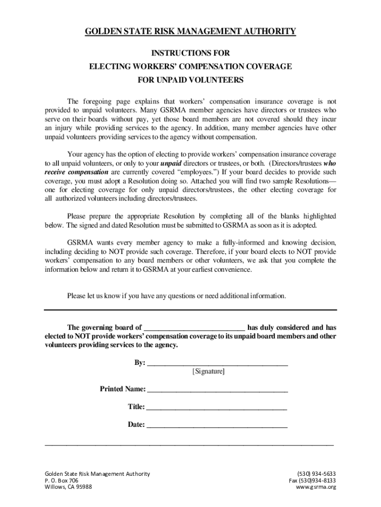 This document provides guidelines for agencies to elect workers\' compensation insurance coverage for unpaid volunteers, including directors and trustees. It explains the options available for coverage and the necessary steps to adopt a resolution if the agency decides to provide such coverage or not.