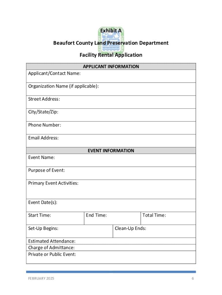 Beaufort County Land Preservation Department Facility Rental Policy, Application and Fee Schedule Applicability This facility rental policy applies to all Land Preservation Department managed property, buildings and structures (collectively referred to as Property), owned by Beaufort County. All requests for meetings, conferences, gatherings, or events on Properties are subject to this policy. All picnic pavilions on Land Preservation Department managed Properties are on a firstcome,...