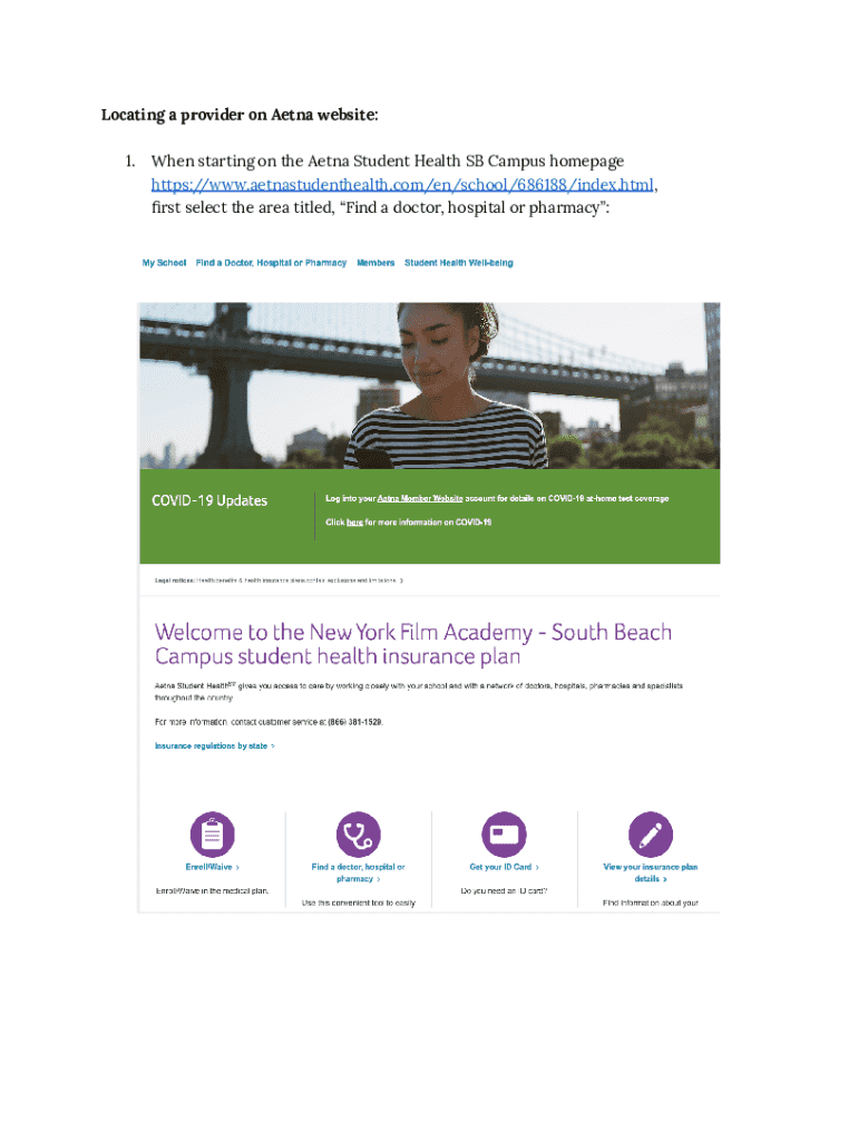 Locating a provider on Aetna website: 1.When starting on the Aetna Student Health SB Campus homepage https://www.aetnastudenthealth.com/en/school/686188/index.html, first select the area titled, Find a doctor, hospital or pharmacy:2. Be sure to click on Option 1, as you will be searching for a provider innetwork. Innetwork providers are providers that accept your insurance plan:3. Click on Start a New Search to begin:4. Next screen is important as you will have to input your