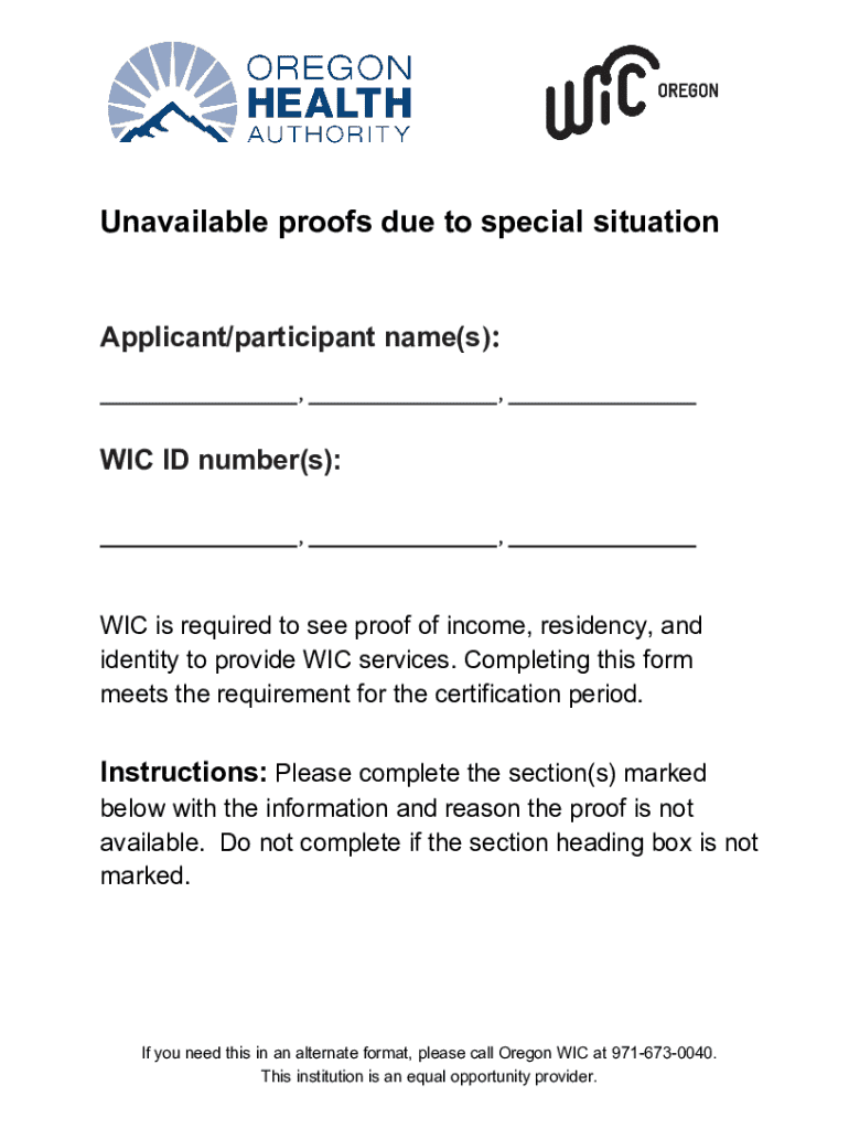 Este formulario es requerido por WIC para documentar la falta de pruebas de ingresos, residencia e identidad debido a situaciones especiales. Completar este formulario cumple con los requisitos para el período de certificación.