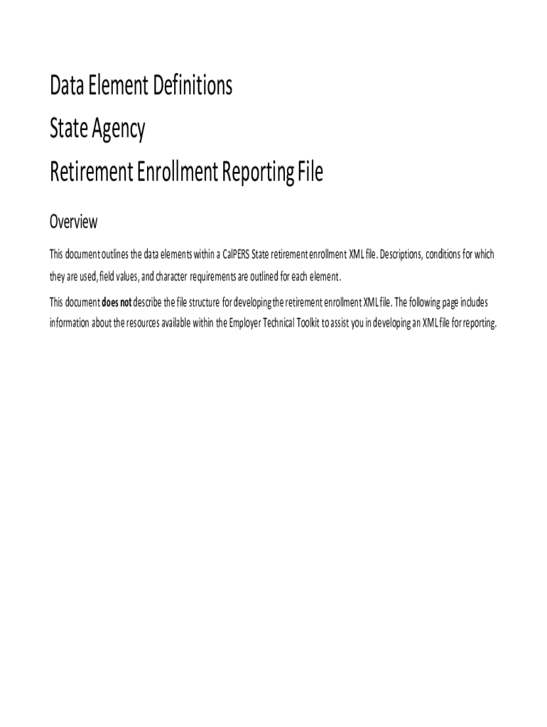 Data Element Definitions State Agency Retirement Enrollment Reporting File Overview This document outlines the data elements within a CalPERS State retirement enrollment XML file. Descriptions, conditions for which they are used, field values, and character requirements are outlined for each element. This document does not describe the file structure for developing the retirement enrollment XML file. The following page includes information about the resources available within the Employer...