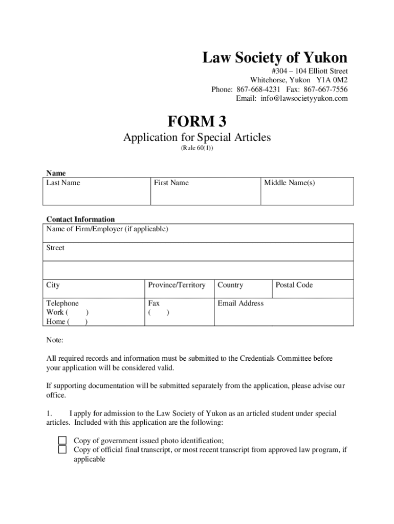 This form is used to apply for admission to the Law Society of Yukon as an articled student under special articles, including necessary documentation and information required for consideration by the Credentials Committee.