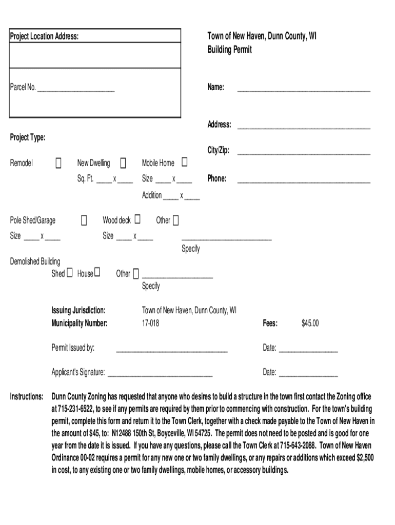 This document is a building permit application for the Town of New Haven, Dunn County, WI. It includes sections for the applicant\'s information, project details, and zoning compliance. The permit