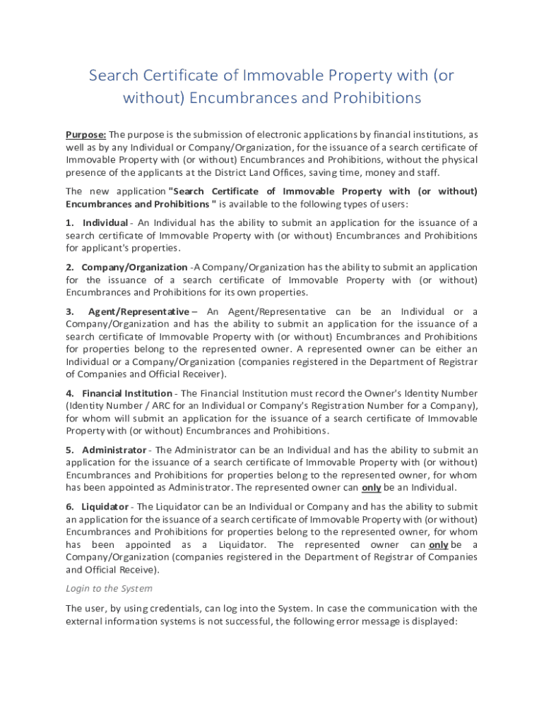 Get the free Search Certificate of Immovable Property With (or Without) Encumbrances and Prohibit...