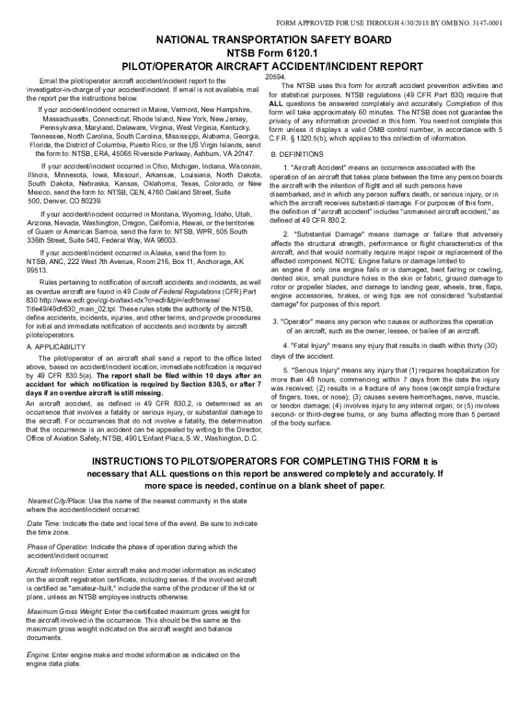 Este formulario es utilizado por la Junta Nacional de Seguridad del Transporte (NTSB) para actividades de prevención de accidentes de aeronaves y para fines estadísticos. Se requiere que todas las