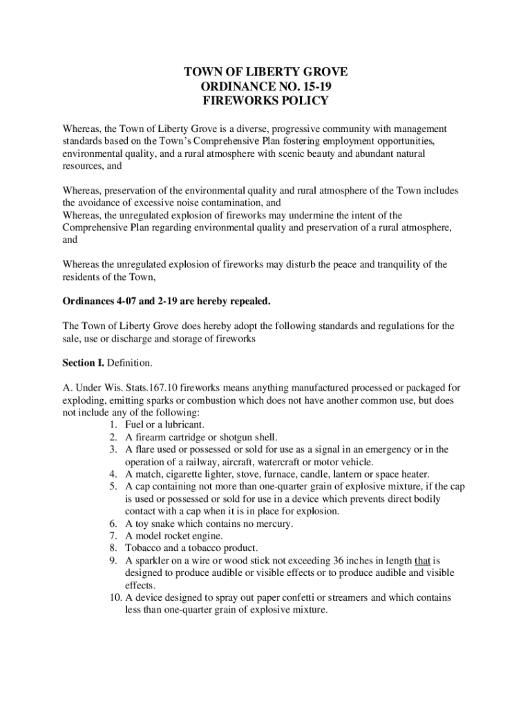 An ordinance that regulates the sale, use, and discharge of fireworks in the Town of Liberty Grove, emphasizing environmental preservation and community safety.