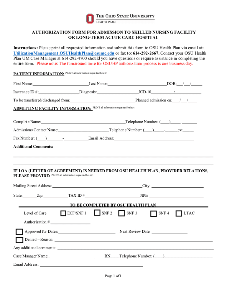 Get the free Authorization Form for Admission to Skilled Nursing Facility or Long-term Acute Care...