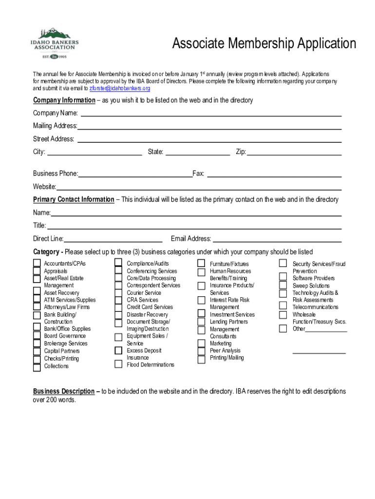 Application form for Associate Membership with the Idaho Bankers Association, outlining membership fees, company and primary contact information requirements, category selection, and payment options.