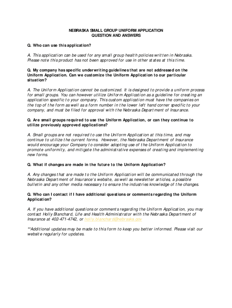 Small businesses in Nebraska that offer health insurance coverage to their employees are required to file the Nebraska small group uniform.