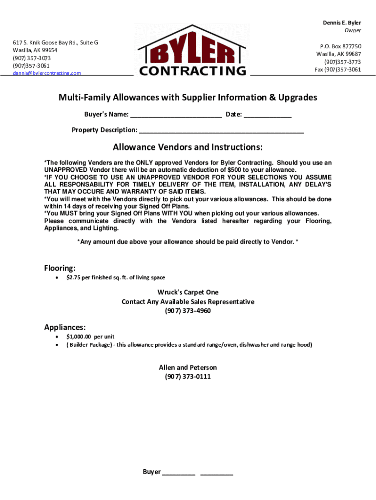 Dennis E. Byler Owner 617 S. Knik Goose Bay Rd., Suite G Wasilla, AK 99654 (907) 3573073 (907)3573061P.O. Box 877750 Wasilla, AK 99687 (907)3573773 Fax (907)3573061dennis@bylercontracting.comMultiFamily Allowances with Supplier Information & Upgrades Buyer\'s Name: ___ Date: ___ Property Description: ___Allowance Vendors and Instructions: *The following Venders are the ONLY approved Vendors for Byler Contracting. Should you use an UNAPPROVED Vendor there will be an automatic deduction of $500...