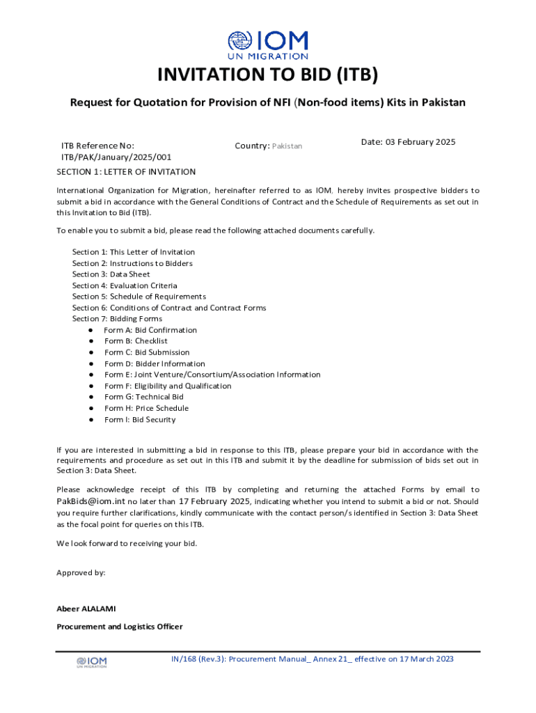 Esta invitación a presentar ofertas está realizada por la Organización Internacional para las Migraciones (OIM) para la provisión de kits de artículos no alimentarios en Pakistán, incluyendo