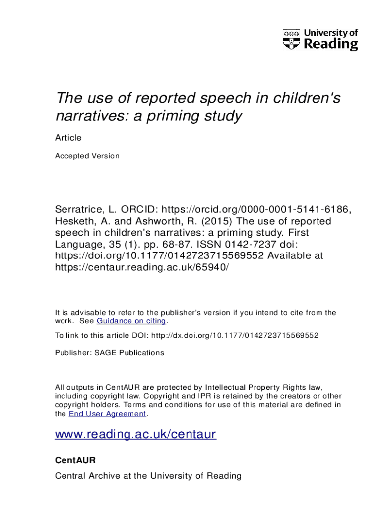 The use of reported speech in children\'s narratives: a priming study Article Accepted VersionSerratrice, L. ORCID: https://orcid.org/0000000151416186, Hesketh, A. and Ashworth, R. (2015) The use