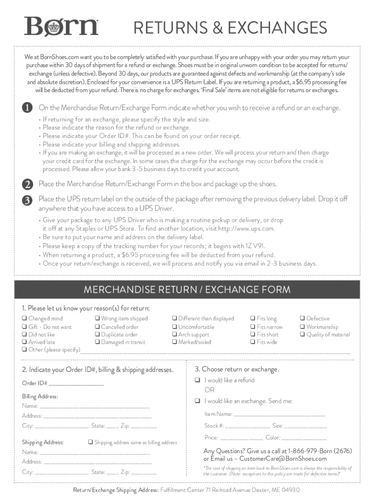 Ce formulaire est utilisé pour retourner ou échanger des articles achetés sur BornShoes.com. Les clients peuvent demander un remboursement ou un échange en remplissant les informations requises, y compris l\'ID de commande, les adresses de facturation et d\'expédition, ainsi que la raison du retour ou de l\'échange.