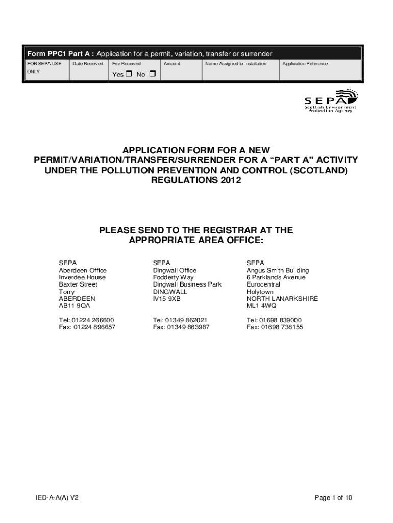 Form to apply for a new permit, variation, transfer, or surrender under the Pollution Prevention and Control (Scotland) Regulations 2012. The form includes information on installation, application type, operator details, and required supplementary documents.