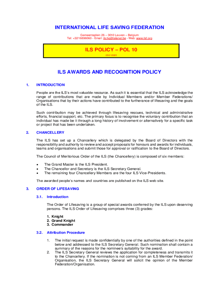 This document outlines the policies and procedures surrounding awards and recognition provided by the International Life Saving Federation (ILS) for individual members and organizations contributing