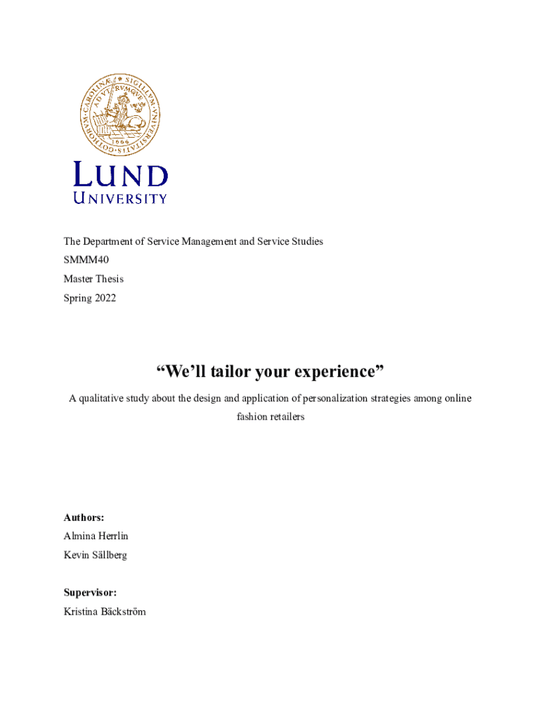 This master thesis explores the design and application of personalization strategies in online fashion retailing, focusing on how retailers can improve customer experience through data collection, content personalization, and interface personalization. It discusses the challenges retailers face, including privacy concerns and the importance of using both customer data and technology effectively.