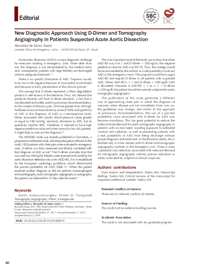 Editorial New Diagnostic Approach Using DDimer and Tomography Angiography in Patients Suspected Acute Aortic Dissection Alexandre de Matos Soeiro Unidade Clnica de Emergncia InCor HCFMUSP, So Paulo,