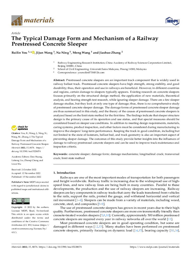 materials ArticleThe Typical Damage Form and Mechanism of a Railway Prestressed Concrete Sleeper Ruilin You 1, * , Jijun Wang 1 , Na Ning 1 , Meng Wang 1 and Jiashuo Zhang 2 12*Citation: You, R.; Wang, J.; Ning, N.; Wang, M.; Zhang, J. The Typical Damage Form and Mechanism of a Railway Prestressed Concrete Sleeper. Materials 2022, 15, 8074. https://Railway Engineering Research Institution, China Academy of Railway Sciences Corporation Limited, Beijing 100081, China School of Civil Engineering,