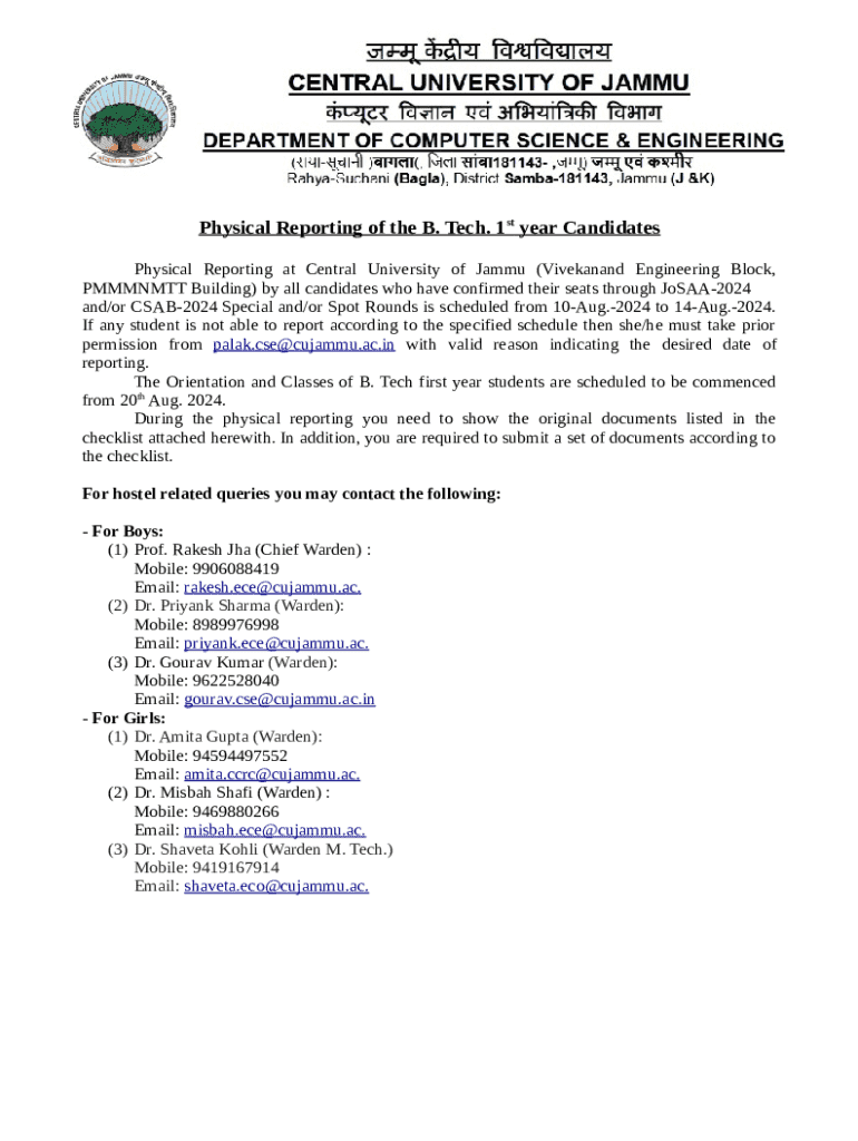 यह फॉर्म सभी छात्रों के लिए है, जो केंद्रीय विश्वविद्यालय जम्मू में बी.टेक. पहले वर्ष के लिए अपनी सीटों की पुष्टि कर चुके हैं। फॉर्म में छात्रों से उनकी व्यक्तिगत जानकारी, दस्तावेज़, और माता-पिता/अभिभावक का सहमति पत्र 제공 करने के लिए कहा गया है।