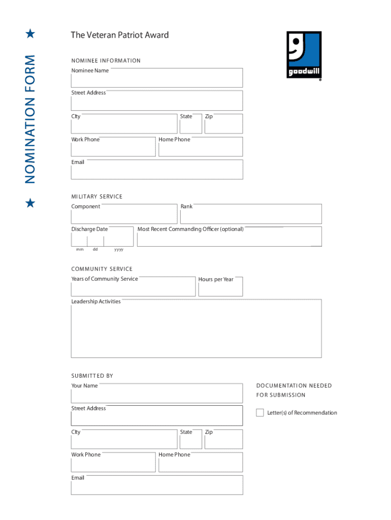 RECEPTIONOFHONORPatriot Award Guidelines Nomination Deadline: Tuesday, Sept. 10TH, 2024 & Nomination Forms Nomination forms and supporting documentation must be complete. Incomplete forms will be