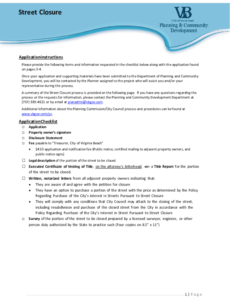 This document outlines the instructions for applying for a street closure in the City of Virginia Beach, detailing required items and information along with the process involving the Planning Commission