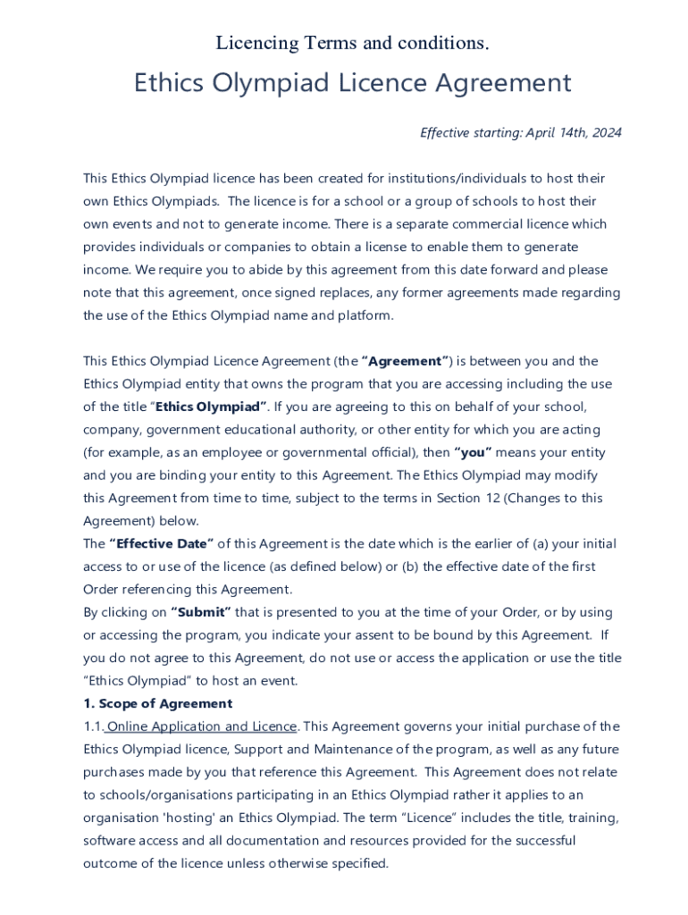 Licencing Terms and conditions.Ethics Olympiad Licence Agreement Effective starting: April 14th, 2024 This Ethics Olympiad licence has been created for institutions/individuals to host their own Ethics Olympiads. The licence is for a school or a group of schools to host their own events and not to generate income. There is a separate commercial licence which provides individuals or companies to obtain a license to enable them to generate income. We require you to abide by this agreement from...
