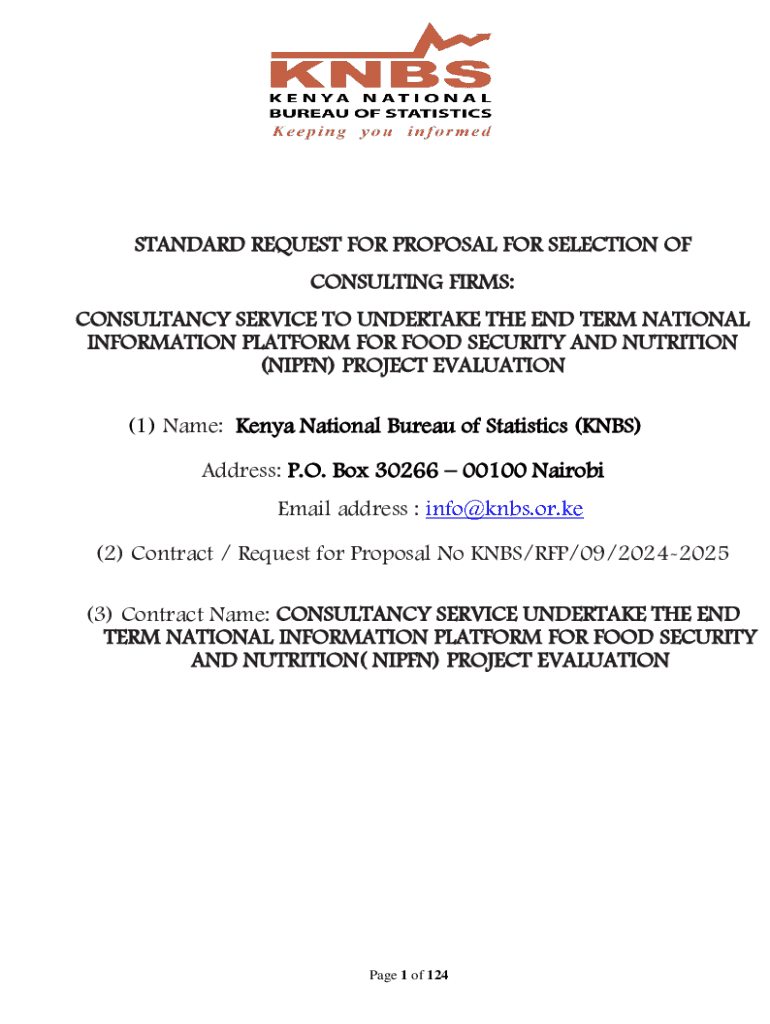 This document is a request for proposals for consulting services to evaluate the NIPFN project implemented in Kenya. The evaluation aims to assess project outcomes, deliverables, and sustainability, and provide recommendations for future similar projects.