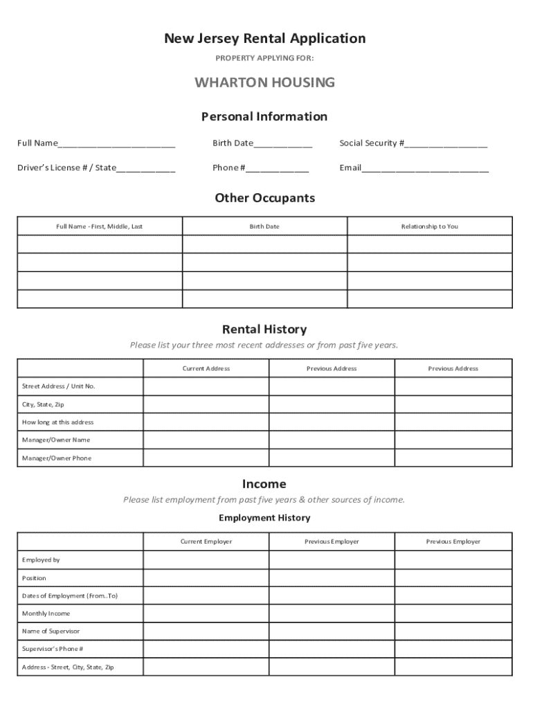 This document is a rental application for individuals seeking to rent a property in New Jersey. It requires personal information, rental history, employment details, income sources, and consent for a background check. The application also addresses potential issues such as evictions, criminal history, and bankruptcy.