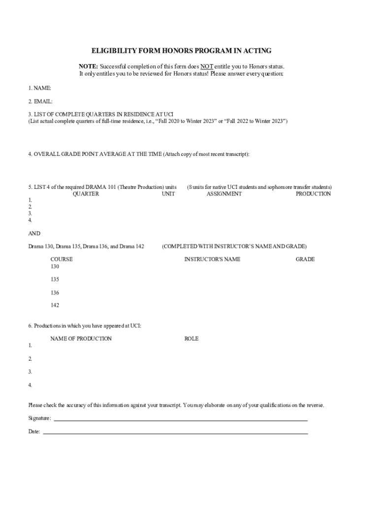 Get the free Eligibility Form Honors Program in Acting - drama arts uci