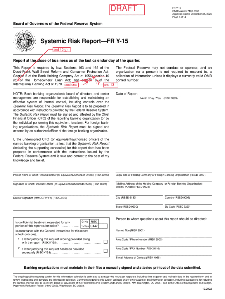 Este informe es necesario por ley para evaluar el riesgo sistémico de las organizaciones bancarias. Las instituciones deben prepararlo según las instrucciones de la Reserva Federal y debe ser firmado por su CFO o un funcionario autorizado. Incluye indicadores de tamaño, interconexión, sustituibilidad, complejidad y actividad transfronteriza.