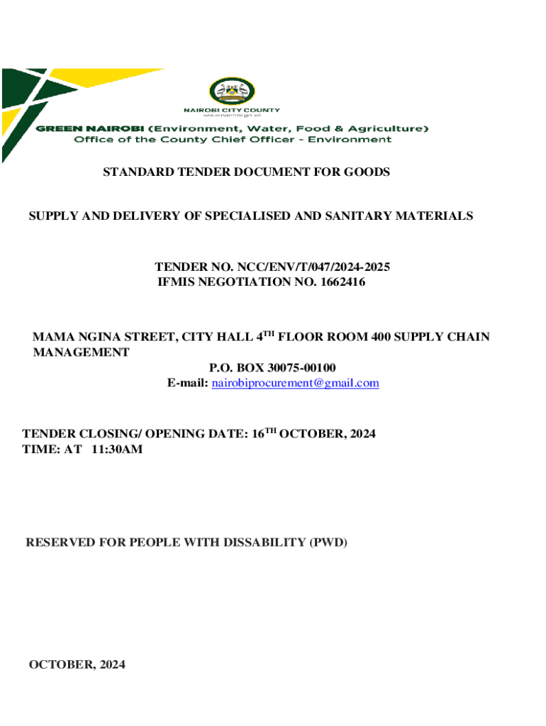 This document provides the terms and conditions for submitting tenders for the supply and delivery of specialised and sanitary materials for Nairobi City County Government. It outlines the tendering