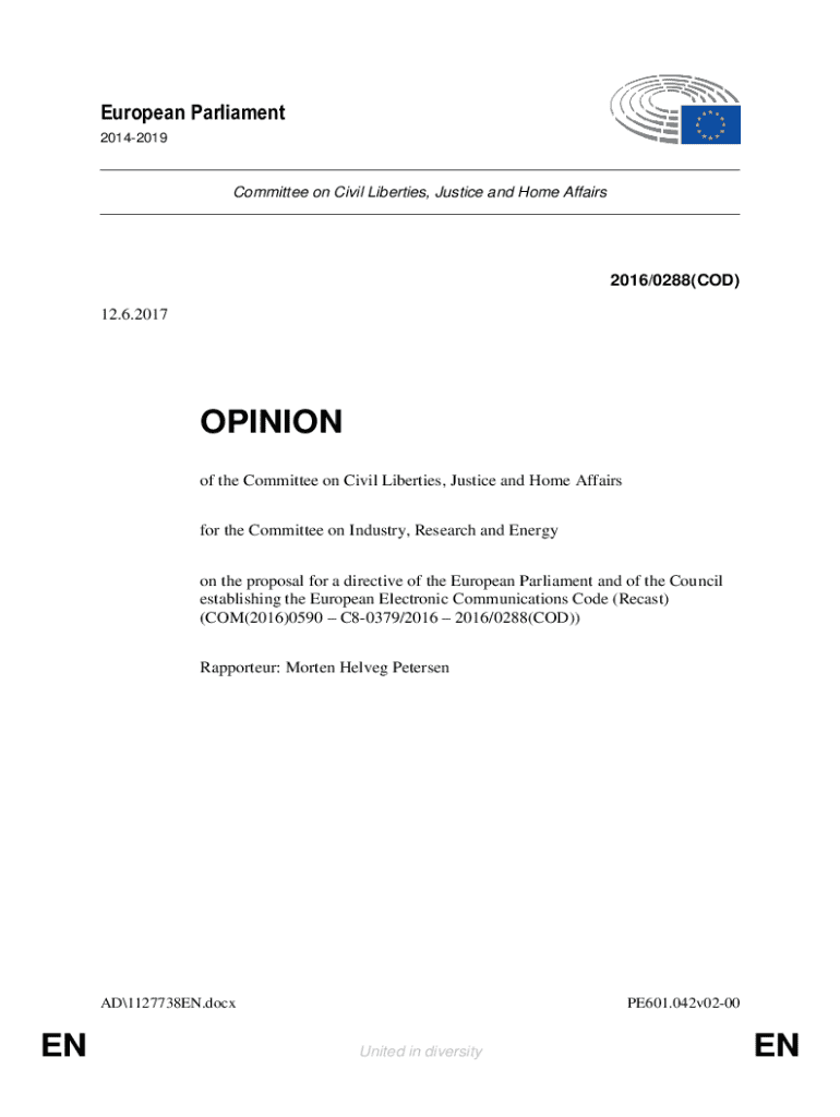 European Parliament 20142019Committee on Civil Liberties, Justice and Home Affairs2016/0288(COD) 12.6.2017OPINION of the Committee on Civil Liberties, Justice and Home Affairs for the Committee on Industry, Research and Energy on the proposal for a directive of the European Parliament and of the Council establishing the European Electronic Communications Code (Recast) (COM(2016)0590 C80379/2016 2016/0288(COD)) Rapporteur: Morten Helveg PetersenAD1127738EN.docxENPE601.042v0200 United in...