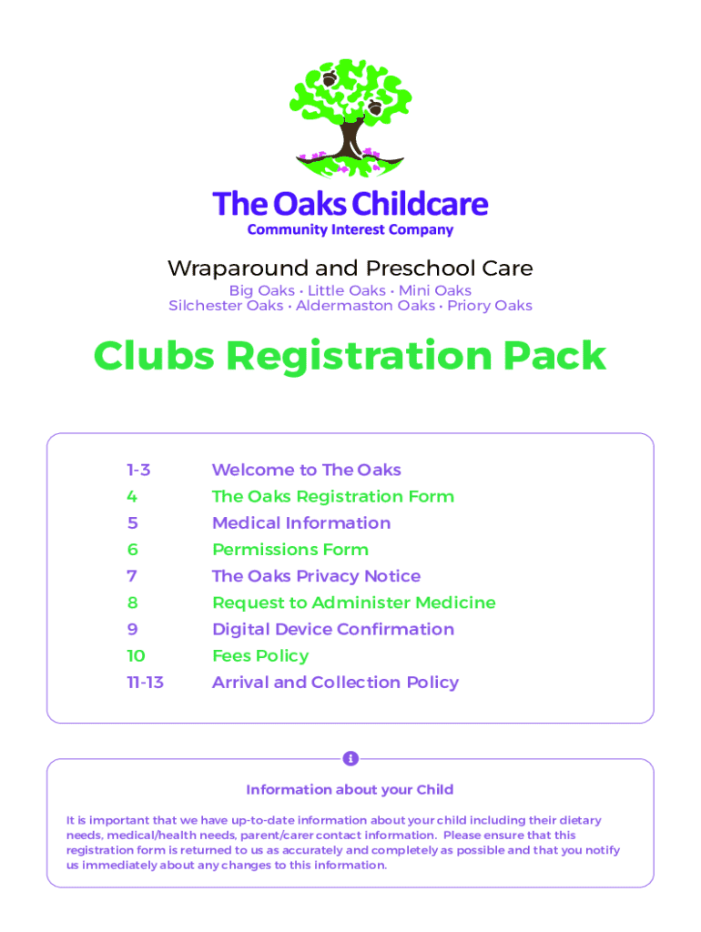 This document contains important information and forms related to The Oaks Childcare Clubs, providing details about registration, medical information, permissions, fees policies, communication, and
